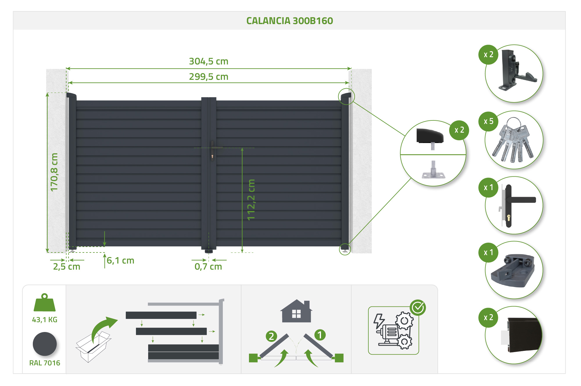 CALANCIA 3m augstuma, 160cm veramie vārti, pelēks alumīnijs