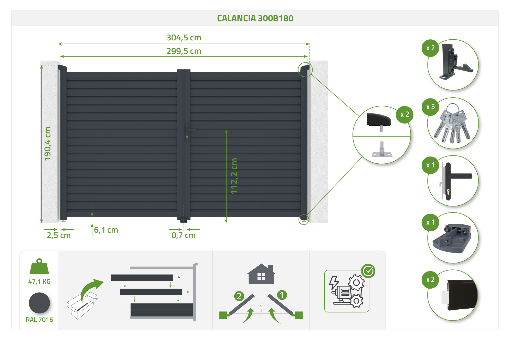 CALANCIA 3m augstumā 180cm veramie vārti, pelēks alumīnijs