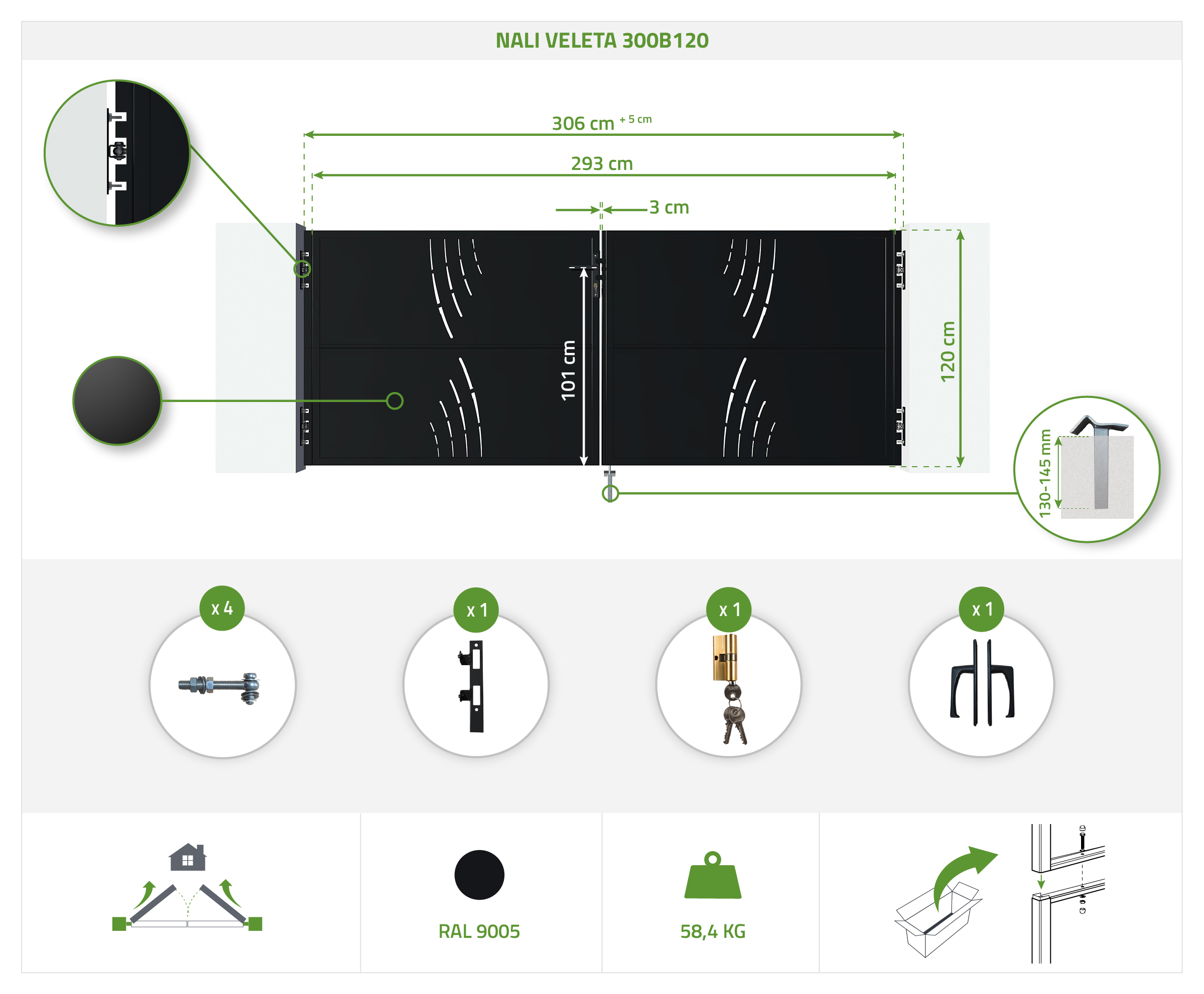 Dzelzs vārti NALI VELETA 300x120 cm matēti melni