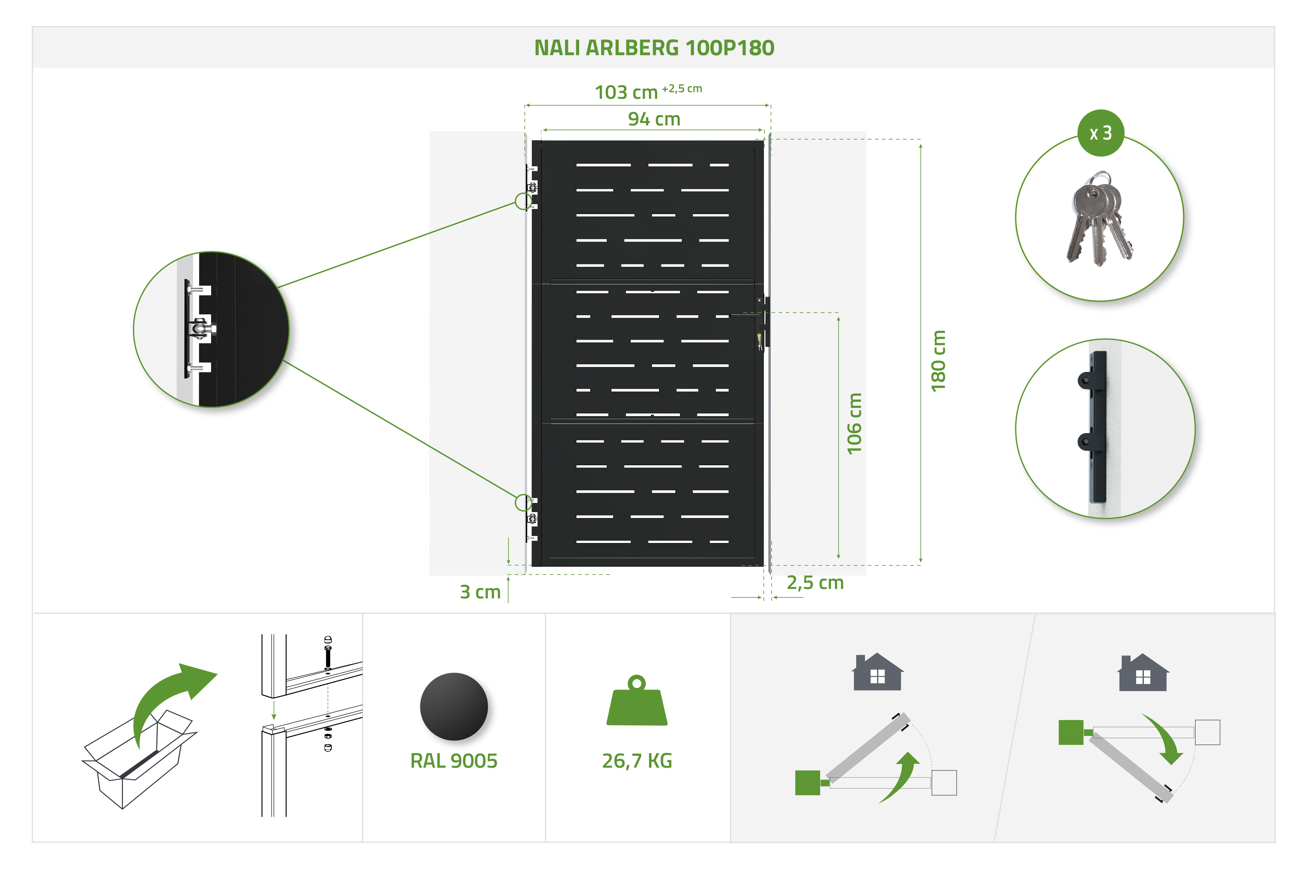 NALI ARLBERG cinkotie tērauda vārti izceļas, pateicoties to "grafisko līniju" rakstiem, kas dizainam piešķir mūsdienīgu un izsmalcinātu pieskārienu. Šīs ģeometriskās formas piešķir unikālu vizuālu pieskārienu, vienlaikus saglabājot privātumu un izturību. Šie masīvie tērauda vārti ir ideāli piemēroti tiem, kas vēlas apvienot gan drošību, gan estētiku savās ārtelpās, pateicoties to mūsdienīgajam dizainam.