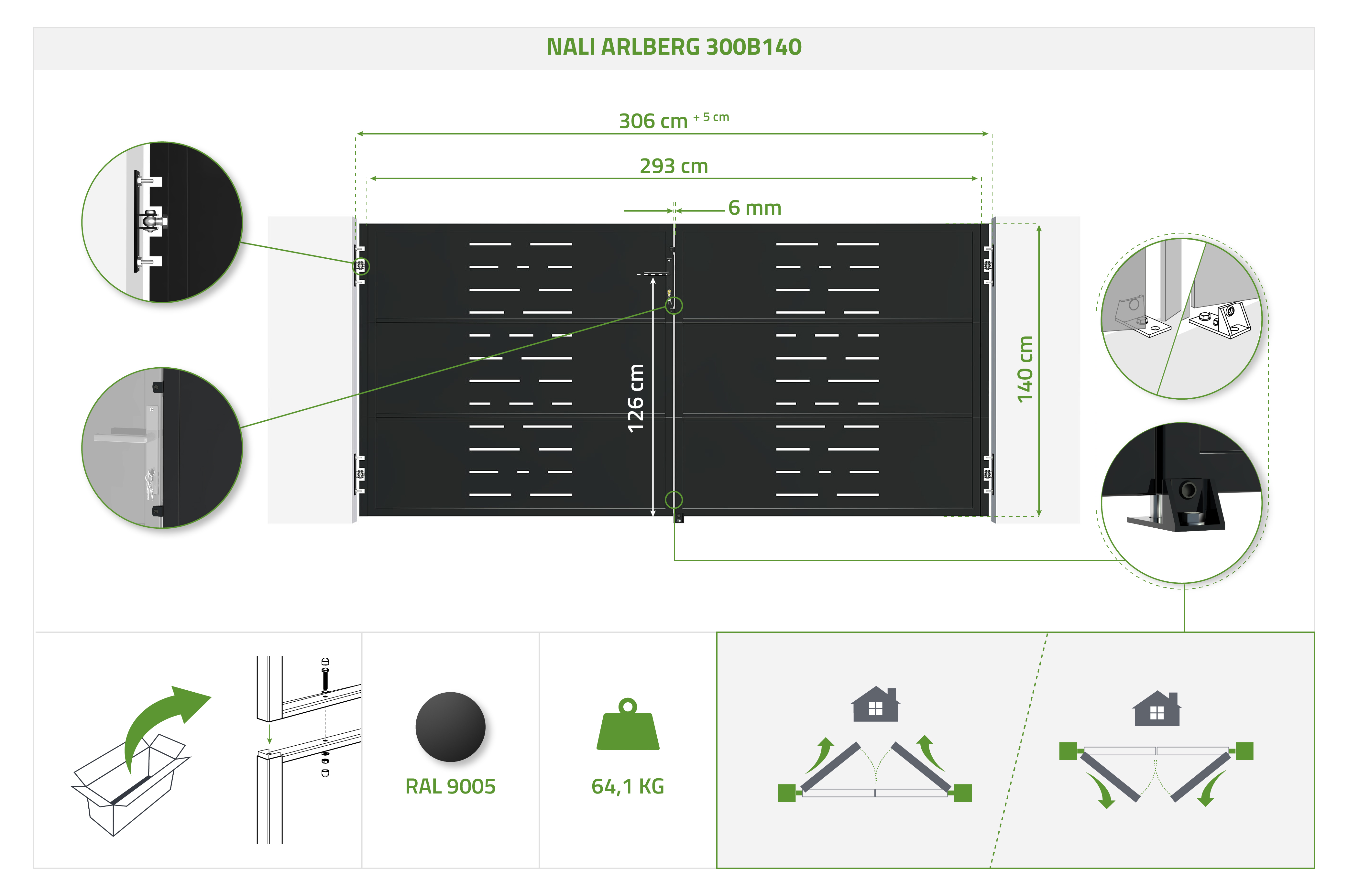 NALI ARLBERG tērauda veramie vārti izceļas ar grafiskiem līniju rakstiem, kas piešķir kopējam izskatam modernu un elegantu pieskārienu. Šie ģeometriskie raksti piešķir unikālu vizuālo dimensiju, vienlaikus saglabājot privātumu un izturību. Ar savu mūsdienīgo dizainu šie dzelzs veramie vārti ir ideāli piemēroti tiem, kas savās āra telpās meklē gan aizsardzību, gan estētiku.