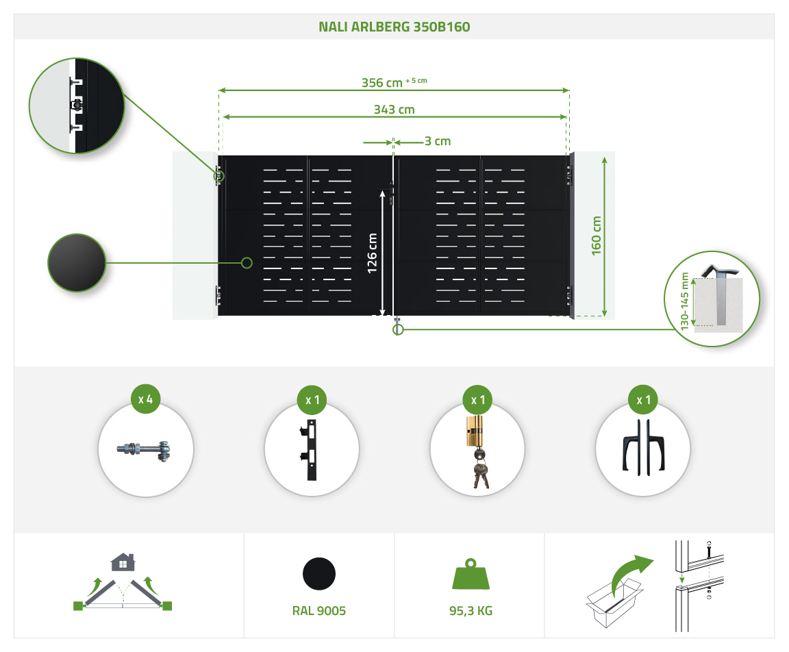 NALI ARLBERG dzelzs vārti 350x160 cm matēti melni